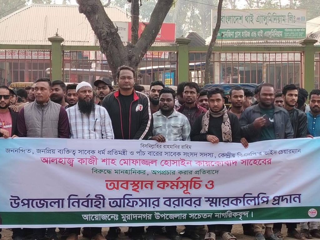 বিএনপির ভাইস চেয়ারম্যান ও কুমিল্লা-৩ মুরাদনগর আসনের ৫বারের সাবেক সংসদ সদস্য কাজী শাহ মোফাজ্জল হোসাইন কায়কোবাদের বিরুদ্ধে সামাজিক যোগাযোগ মাধ্যম ফেইসবুকে মিথ্যা অপপ্রচার ও ভূয়া কল রেকর্ড প্রচারের মাধ্যমে সম্মানহানির প্রতিবাদে অবস্থান কর্মসূচী পালন করেছে মুরাদনগরের সচেতন নাগরিক সমাজ। সোমবার দুপুরে উপজেলা পরিষদের শহীদ স্মৃতিস্তম্ভের সামনে এই অবস্থান কর্মসূচী পালন করা হয়। অবস্থান কর্মসূচী পালন শেষে উপজেলা নির্বাহী অফিসারের কার্যালয়ে স্মারকলিপি প্রদান করা হয়েছে।