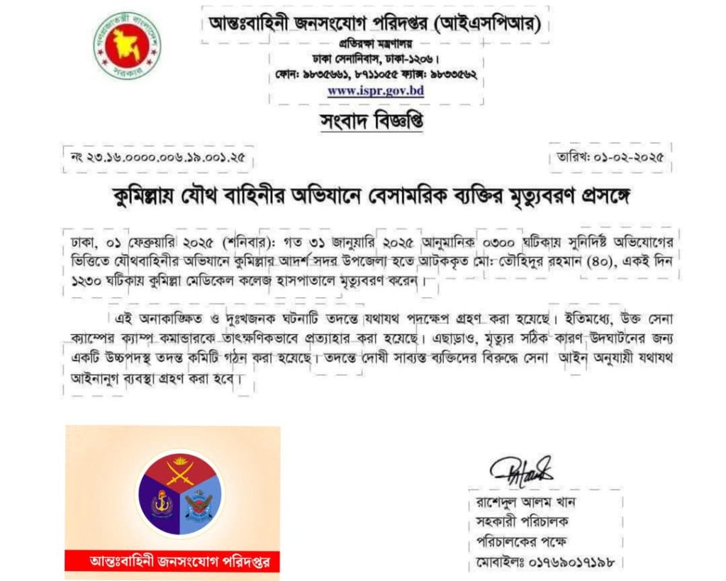 বিজ্ঞপ্তিতে বলা হয়, গত ৩১ জানুয়ারি রাতে সুনির্দিষ্ট অভিযোগের ভিত্তিতে যৌথবাহিনীর অভিযানে কুমিল্লার আদর্শ সদর উপজেলা হতে আটক মো. তৌহিদুর রহমান (৪০) দুপুর সাড়ে ১২টায় কুমিল্লা মেডিকেল কলেজ হাসপাতালে মৃত্যুবরণ করেন।
