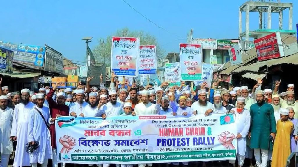 ফিলিস্তিনের গাজা উপত্যকায় ফের ইসরাইলের বিরুদ্ধে বর্বরোচিত গণহত্যার প্রতিবাদে বিক্ষোভ মিছিল করেছেন কুমিল্লার মুরাদনগর উপজেলা সোনাকান্দা দারুল হুদা দরবার শরীফের আত্মশুদ্ধি মূলক অরাজনৈতিক সংগঠন বাংলাদেশ তা’লীমে হিযবুল্লাহ। মঙ্গলবার বিকালে উপজেলার বাঙ্গরা বাজার শাহী কেন্দ্রীয় ঈদগা থেকে কোম্পানীগঞ্জ – নবীনগর সড়কে খামার গ্রাম ও.এস ইসলামিয়া আলিম মাদ্রাসা প্রাঙ্গণে এসে শেষ হয়।