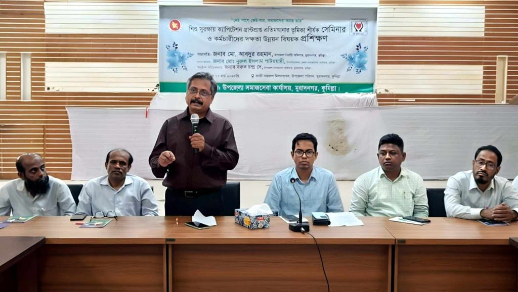 “নেই পাশে কেউ যার, সমাজসেবা আছে তার” এই প্রতিপাদ্যকে সামনে রেখে কুমিল্লার মুরাদনগর উপজেলায় শিশু সুবক্ষায় ক্যাপিটেশন গ্রান্টপ্রাপ্ত এতিমখানার ভূমিকা শীর্ষক সেমিনার ও কর্মচারীদের দক্ষতা উন্নয়ন বিষয়ক প্রশিক্ষন অনুষ্ঠিত হয়েছে।