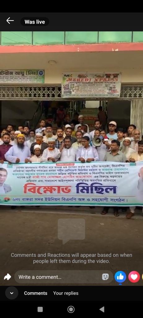 গোপন তৎপরতায় দীর্ঘদিন ধরে অত্যান্ত গুপ্ত সংগঠন কর্তৃক মব সৃষ্টির অপচেষ্টা, বিএনপির প্রতিষ্ঠাতা বহুদলীয় গণতন্ত্রের প্রবক্তা শহীদ প্রেসিডেন্ট জিয়াউর রহমান ও ভারপ্রাপ্ত চেয়ারম্যান তারুণ্যের অহংকার তারেক রহমানকে জড়িয়ে কটুক্তির প্রতিবাদ ও বিএনপির ভাইস চেয়ারম্যান সাবেক মন্ত্রী কাজী মোফাজ্জল হোসেন কায়কোবাদ এর বিরুদ্ধে ষড়যন্ত্রের প্রতিবাদ এবং সারাদেশে আইনশৃঙ্খলা পরিস্থিতির অবনতির প্রতিবাদে বিক্ষোভ মিছিল অনুষ্ঠিত হয়েছে।