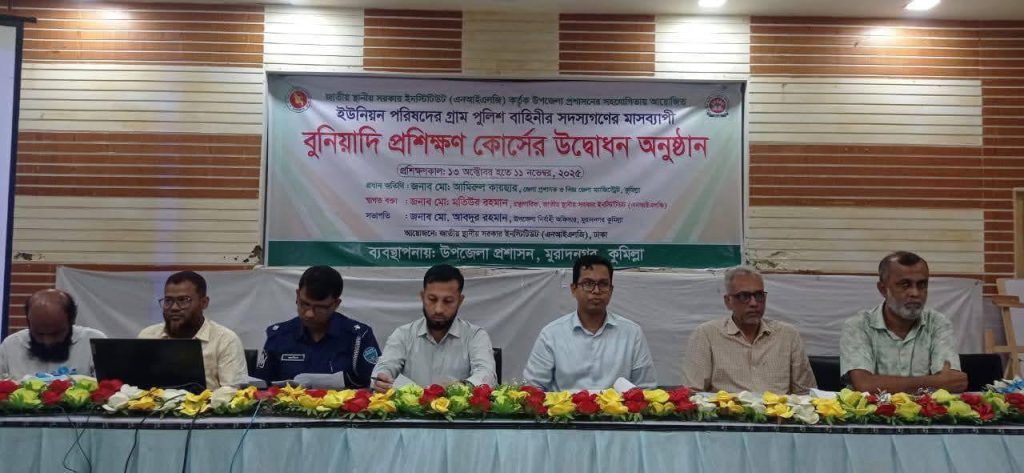 কুমিল্লার মুরাদনগর উপজেলার বিভিন্ন ইউনিয়ন পরিষদের গ্রাম পুলিশ বাহিনীর সদস্যদের মাসব্যাপী বুনিয়াদি আবাসিক প্রশিক্ষণ কোর্স শুরু হয়েছে।গতকাল, ১৩ অক্টোবর আনুষ্ঠানিকভাবে এই কোর্সের উদ্বোধন করা হয়। প্রশিক্ষণটি চলবে আগামী ১১ নভেম্বর, ২০২৫ পর্যন্ত। গ্রামীণ জনপদে আইন-শৃঙ্খলা পরিস্থিতি সমুন্নত রাখা এবং স্থানীয় সরকারের কর্মকাণ্ডকে আরও গতিশীল করার লক্ষ্যে জাতীয় স্থানীয় সরকার ইনস্টিটিউট (এনআইএলজি)-এর উদ্যোগে উপজেলা প্রশাসনের সার্বিক ব্যবস্থাপনায় আয়োজিত এই কোর্সে ২২টি ইউনিয়নের ৪০ জন নতুন নিয়োগপ্রাপ্ত গ্রাম পুলিশ অংশ নিচ্ছেন। তাদের পেশাগত দক্ষতা বৃদ্ধি এবং দায়িত্ব পালনে সক্ষমতা অর্জনের লক্ষ্যেই এই বিশেষ আয়োজন।