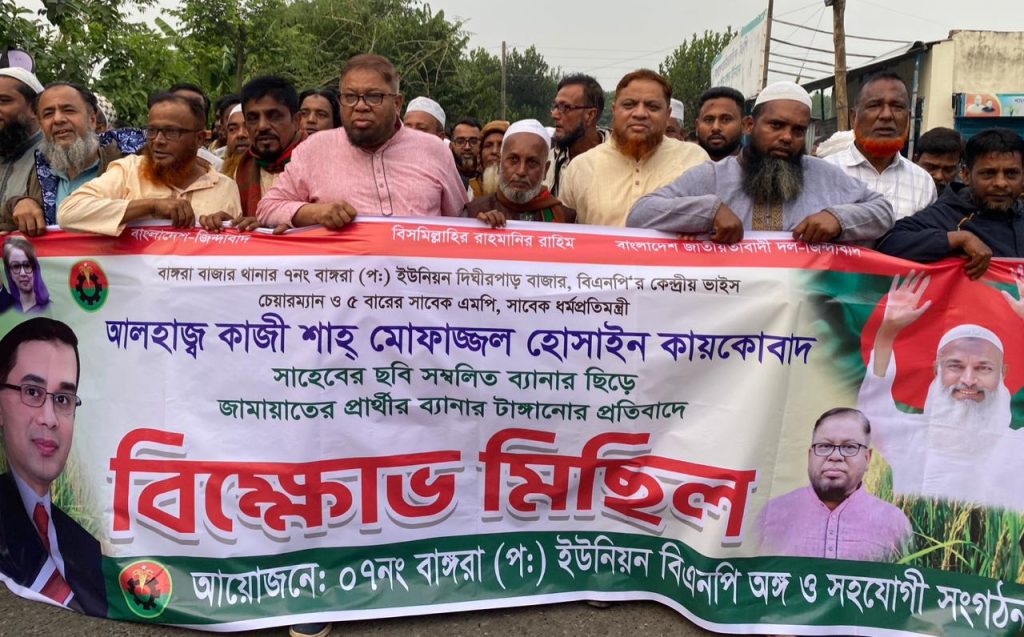 কুমিল্লার বাঙ্গরা বাজার থানার ৭নং বাঙ্গরা (পঃ) ইউনিয়নের দিঘীরপাড় বাজারে বিএনপি’–র কেন্দ্রীয় ভাইস চেয়ারম্যান, সাবেক ধর্মপ্রতিমন্ত্রী ও পাঁচ বারের সাবেক সাংসদ আলহাজ্ব কাজী শাহ্ মোফাজ্জল হোসাইন কায়কোবাদ সাহেবের ছবি–সংবলিত ব্যানার ছেঁড়ে জামায়াত প্রার্থীর ব্যানার টাঙানোর ঘটনায় তীব্র উত্তেজনা সৃষ্টি হয়েছে। এ ঘটনার প্রতিবাদে মঙ্গলবার বিকালে ইউনিয়ন বিএনপি ও অঙ্গ–সহযোগী সংগঠনের উদ্যোগে বিক্ষোভ মিছিল অনুষ্ঠিত হয়।
